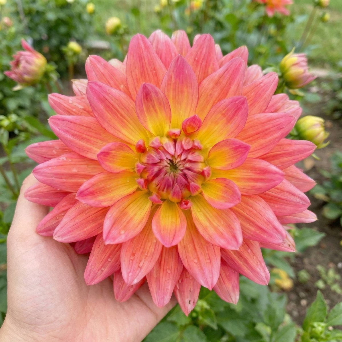 Dahlia ‘Rainbow Silence’ is a delightful decorative variety that features a harmonious blend of soft peach, lilac, and yellow tones. The petals transition gently between these warm, sunset hues, creating a multifaceted bloom that looks different from every angle.